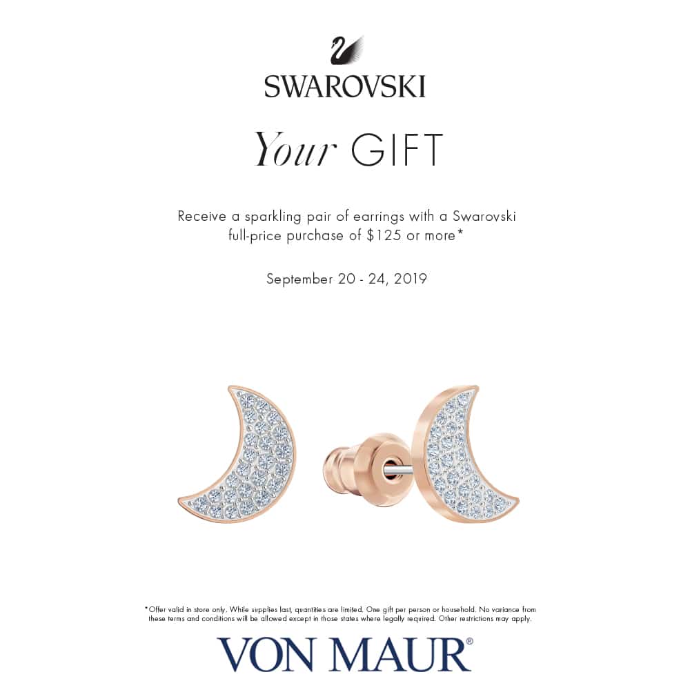 With a single day, full-price Swarovski purchase of $125 or more, customers will receive the Moon Studs for free. Limit one per customer, while supplies last